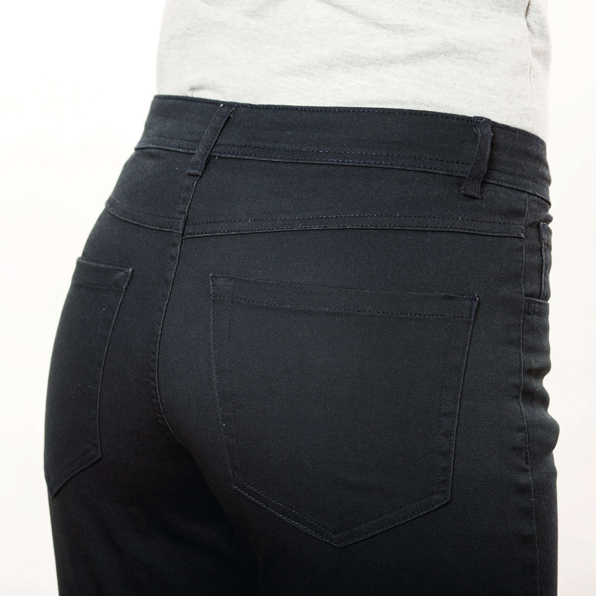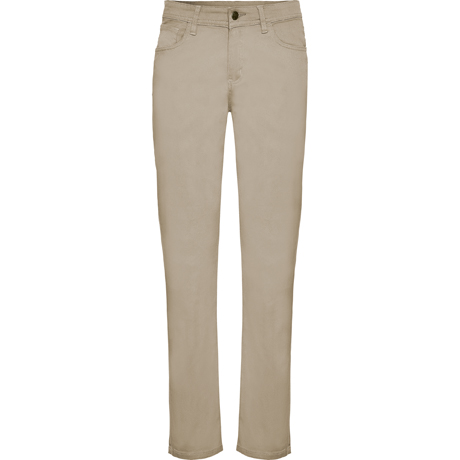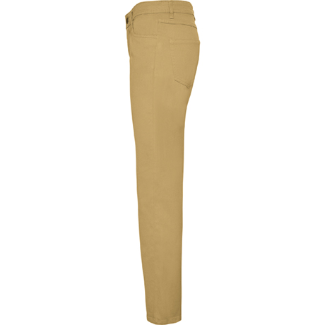 Pantalón largo de mujer, con tejido confortable y resistente. 1.- Dos bolsillos delanteros. Sobre el derecho, además, un bolsillo monedero. 2.- Dos bolsillos traseros con dibujo. 3.- Trabillas para el cinturón. 4.- Detalle de canesú, emulando a los pantalones vaqueros.