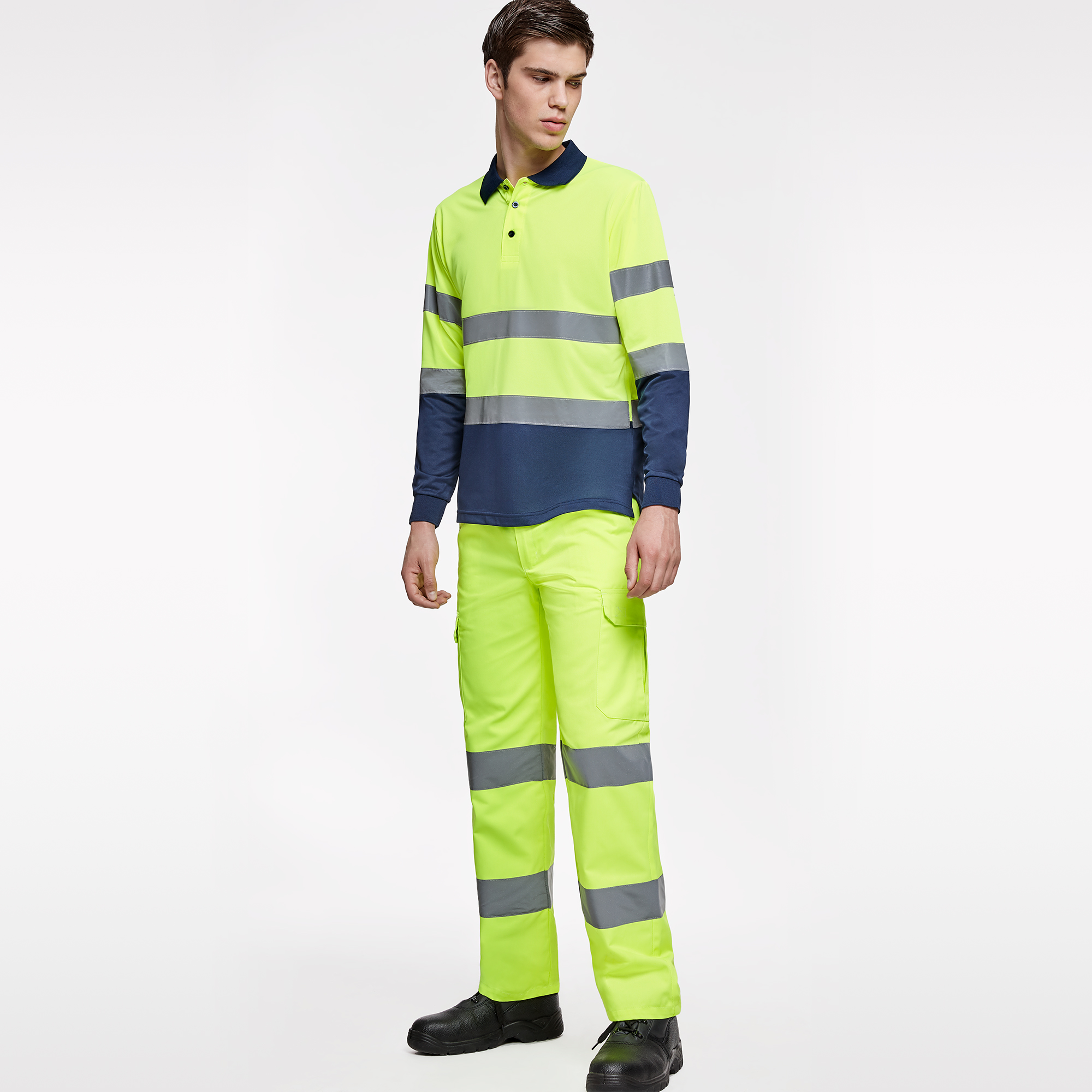 Polo técnico manga larga de alta visibilidad. Con tapeta a 3 botones. Cuello y puños en punto canalé 1×1. Dos bandas reflectantes horizontales en torso y mangas. Tejido anti enganches.